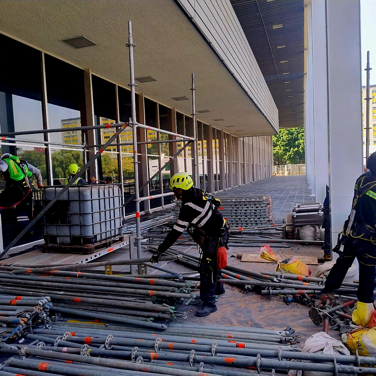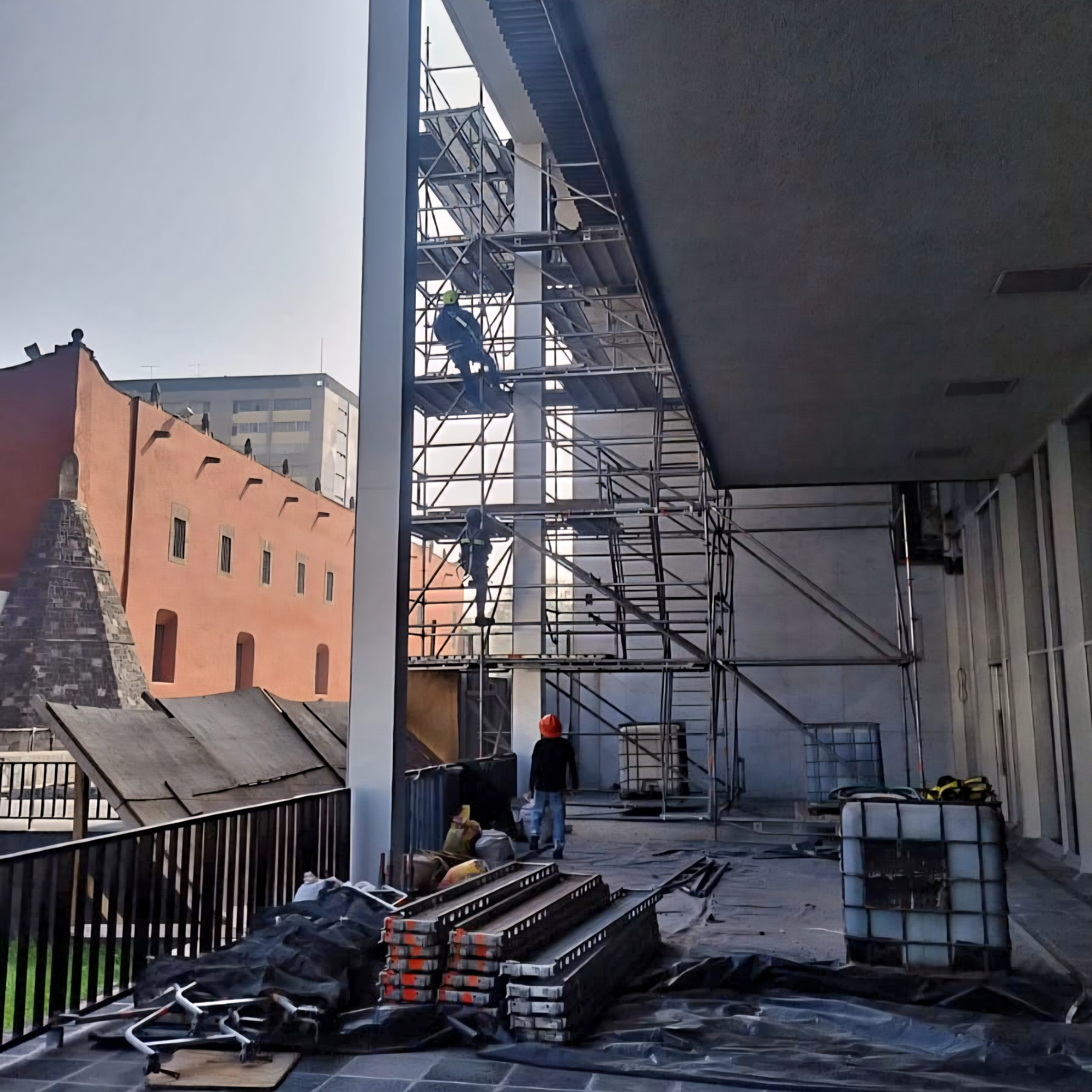 En el Centro Cultural Universitario Tlatelolco (CCUT), la historia no está solo en la fachada: también vive bajo nuestros pies. Restaurar una superficie que colinda con una zona arqueológica exige un compromiso radical con el pasado: intervenir sin tocar el suelo prehispánico. En ANPASA, convertimos ese límite en posibilidad, con una solución de andamio multidireccional que permitió trabajar literalmente “en el aire” y mantener cero impactos sobre el sitio protegido.
